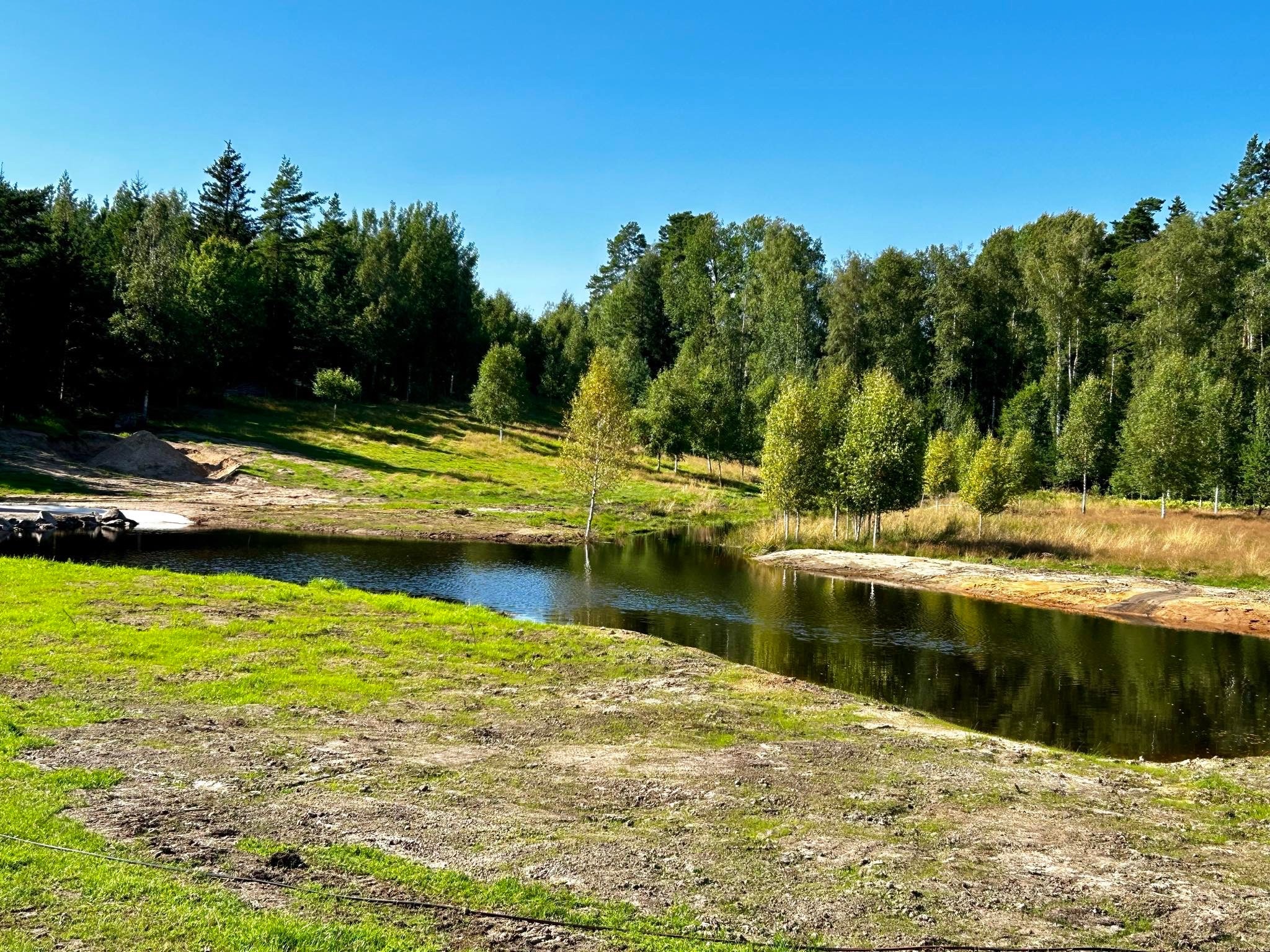 Vi grävde en helt ny damm, samt grävde ner en dammlucka (munk) för att reglera vattennivån.